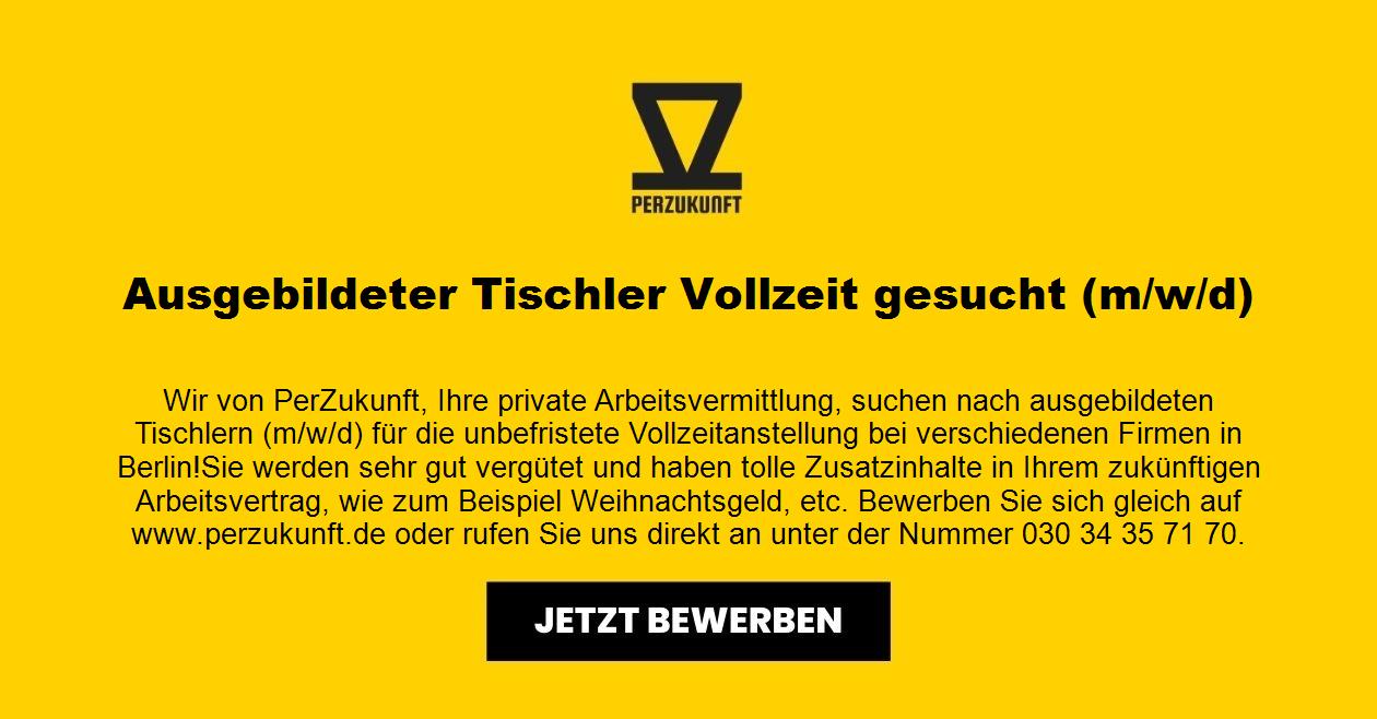 Wir von PerZukunft, Ihre private Arbeitsvermittlung, suchen nach ausgebildeten Tischlern (m/w/d) für die unbefristete Vollzeitanstellung bei verschiedenen Firmen in Berlin! Sie werden sehr gut vergütet und haben tolle Zusatzinhalte in Ihrem zukünftigen Arbeitsvertrag, wie zum Beispiel Weihnachtsgeld, etc. Auf Sie wartet ein kompetentes und professionelles Team, das Ihnen mit Leidenschaft und Hingabe zur Seite steht, um eine Arbeit zu finden. Gerne beraten wir Sie auch!
