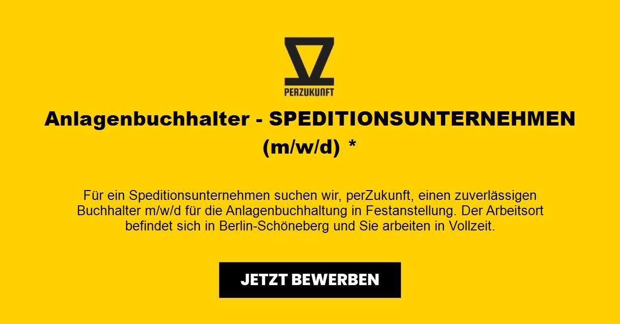 Für ein Speditionsunternehmen suchen wir, PerZukunft, einen zuverlässigen Buchhalter (m/w/d) für die Anlagenbuchhaltung in Festanstellung. Der Arbeitsort befindet sich in Berlin-Schöneberg, und Sie arbeiten in Vollzeit.