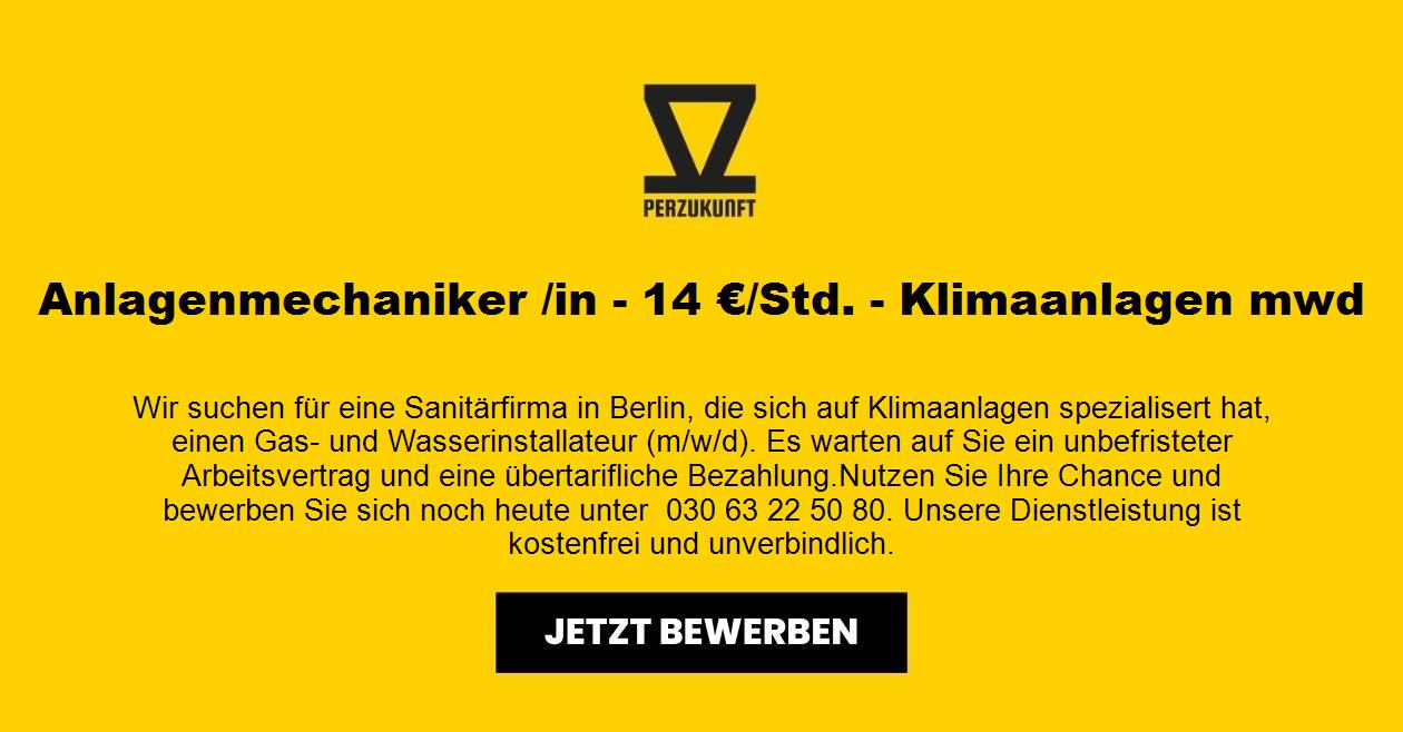 Wir suchen für eine Sanitärfirma in Berlin, die sich auf Klimaanlagen spezialisert hat, einen Gas- und Wasserinstallateur (m/w/d). Es warten auf Sie ein unbefristeter Arbeitsvertrag und eine übertarifliche Bezahlung.