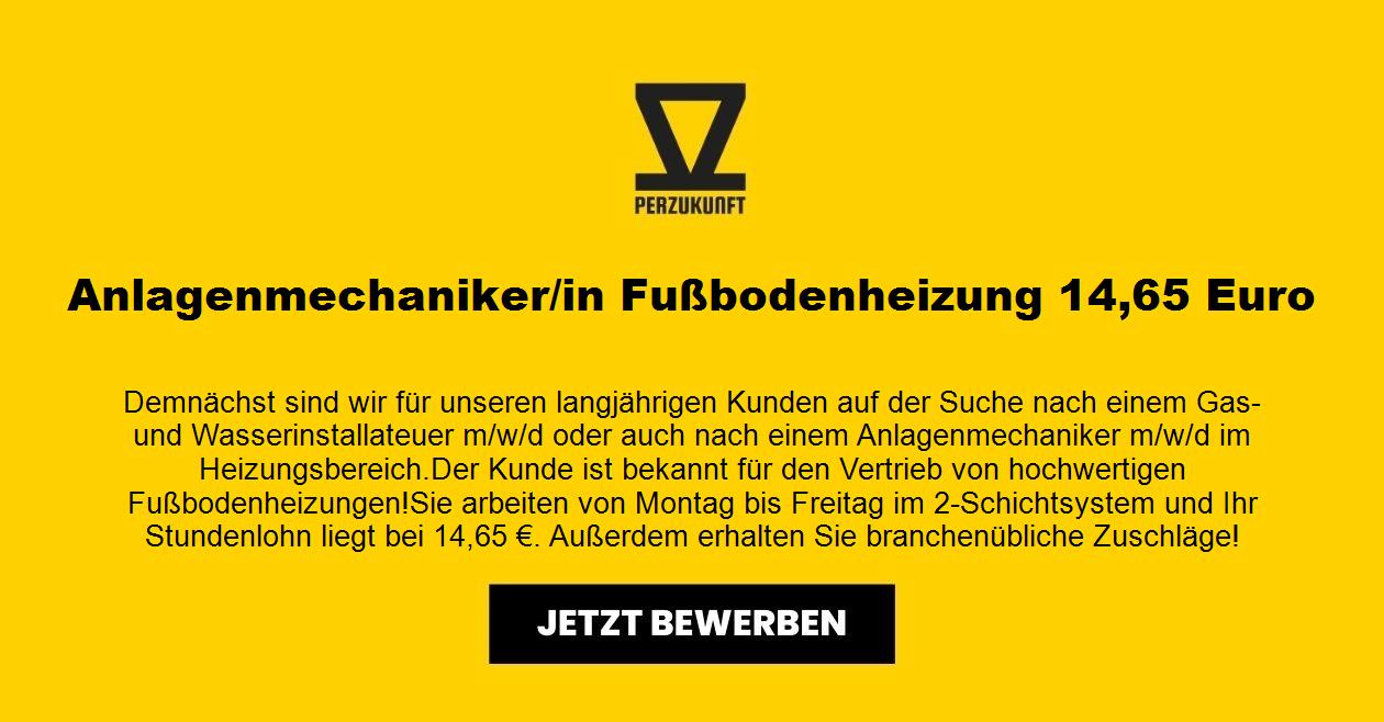 Demnächst sind wir für unseren langjährigen Kunden auf der Suche nach einem Gas- und Wasserinstallateuer m/w/d oder auch nach einem Anlagenmechaniker m/w/d im Heizungsbereich. Der Kunde ist bekannt für den Vertrieb von hochwertigen Fußbodenheizungen! Sie arbeiten von Montag bis Freitag im 2-Schichtsystem und Ihr Stundenlohn liegt bei 15,98 €. Außerdem erhalten Sie branchenübliche Zuschläge!