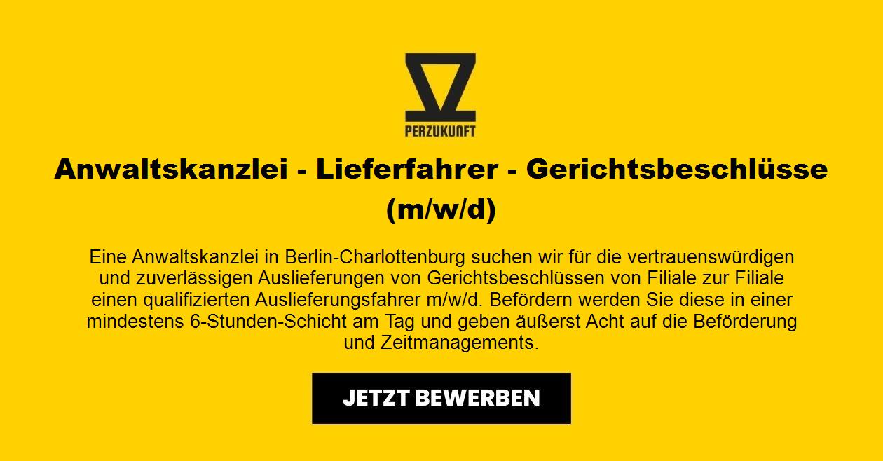Eine Anwaltskanzlei in Berlin-Charlottenburg suchen wir für die vertrauenswürdigen und zuverlässigen Auslieferungen von Gerichtsbeschlüssen von Filiale zur Filiale einen qualifizierten Auslieferungsfahrer m/w/d. Befördern werden Sie diese in einer mindestens 6-Stunden-Schicht am Tag und geben äußerst Acht auf die Beförderung und Zeitmanagements.