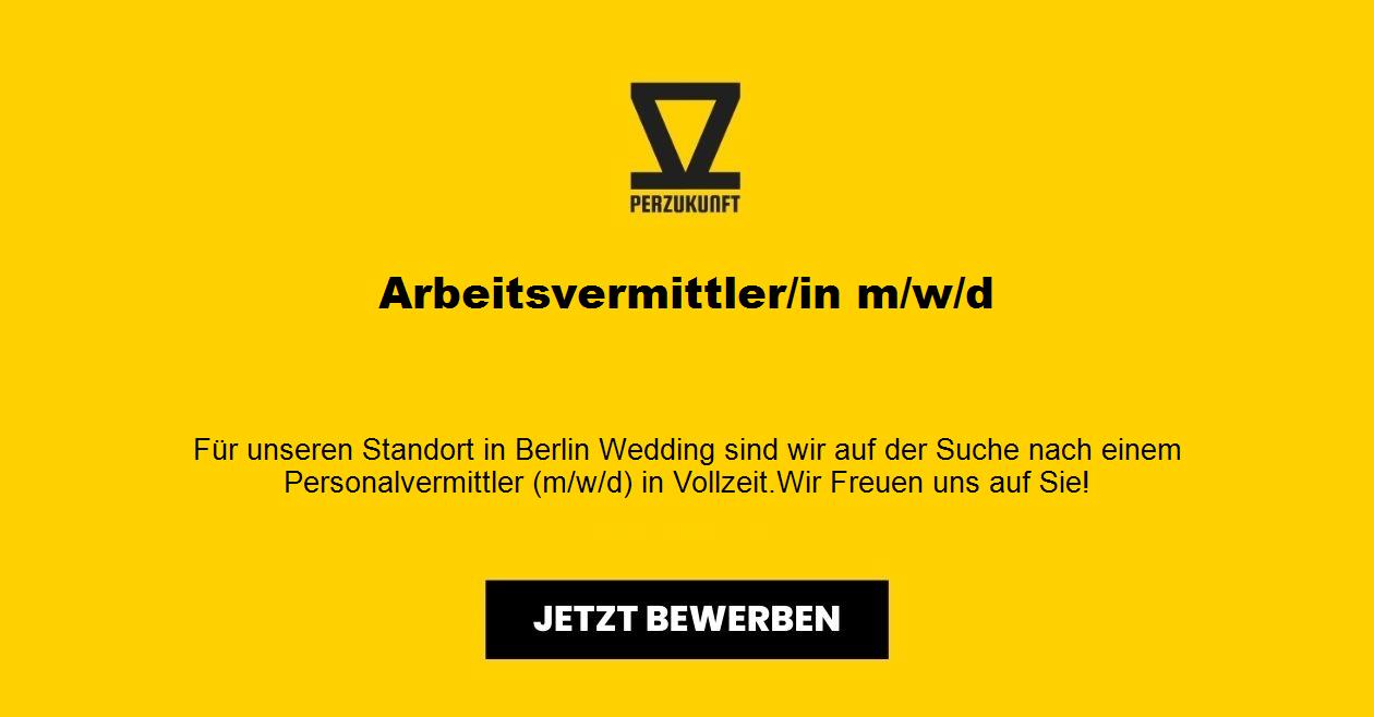Für (unseren) Standort in Berlin Wedding sind wir auf der Suche nach einem Personalvermittler (m/w/d) in Vollzeit. Wir Freuen uns auf Sie!