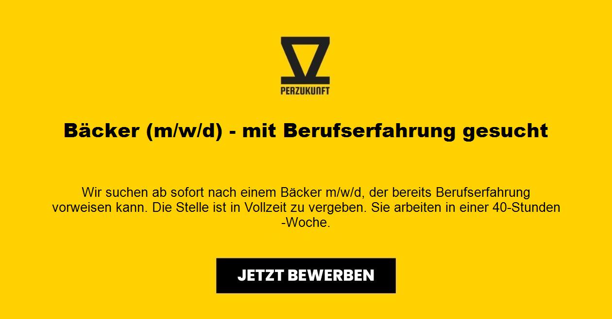 Wir suchen ab sofort nach einem Bäcker m/w/d, der bereits Berufserfahrung vorweisen kann. Die Stelle ist in Vollzeit zu vergeben. Sie arbeiten in einer 40-Stunden-Woche.