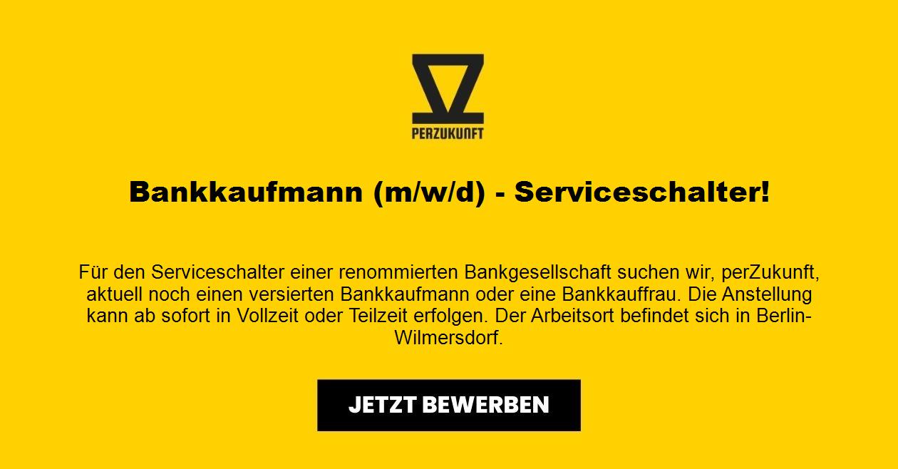 Für den Serviceschalter einer renommierten Bankgesellschaft suchen wir, PerZukunft, aktuell noch einen versierten Bankkaufmann oder eine Bankkauffrau. Die Anstellung kann ab sofort in Vollzeit oder Teilzeit erfolgen. Der Arbeitsort befindet sich in Berlin-Wilmersdorf.