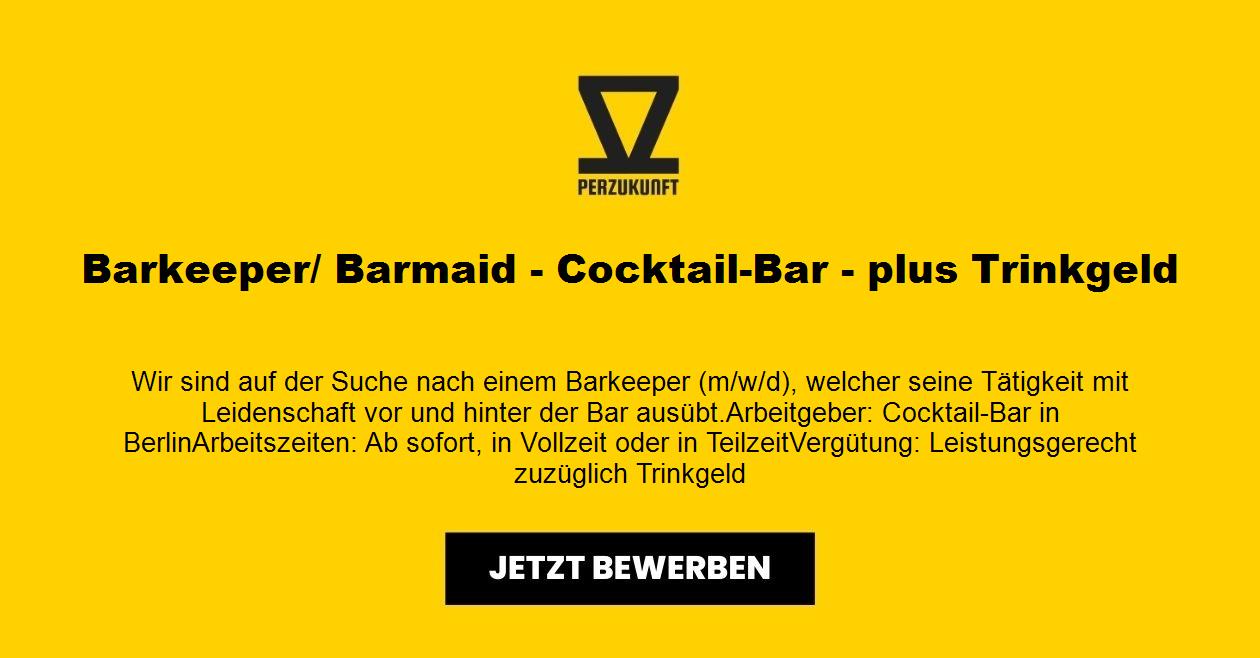 Wir suchen aktuell Sie als Barmixer/in, Barkeeper/in für den Bezirk Friedrichshain. Wir, PerZukunft Arbeitsvermittlung GmbH & Co KG in der Filiale Wedding, sind von DEKRA geprüft und als Träger nach AZAV mit der Zertifizierungsnummer 31T1112195/2 zugelassen. Als private Arbeitsvermittlung arbeiten wir mit den Aktivierungs- und Vermittlungsgutscheinen der Agentur für Arbeit oder des Jobcenters. Zudem kooperieren wir mit einigen unserer Kunden im Bereich Service, welche die Kosten für die erfolgreiche Vermittlung tragen. Mit dem Absenden der Bewerbungsunterlagen erklären Sie sich damit einverstanden, dass Ihre Daten im Rahmen unserer Vermittlertätigkeit elektronisch verarbeitet und gespeichert werden. https://www.perzukunft.de/job/barkeeper-barmaid-cocktail-bar-plus-trinkgeld-1201610000777935