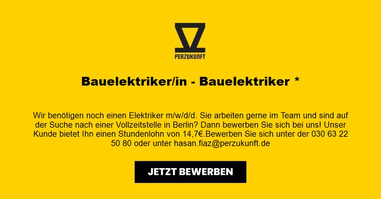 Wir benötigen noch einen Elektriker m/w/d. Sie arbeiten gerne im Team und sind auf der Suche nach einer Vollzeitstelle in Berlin? Dann bewerben Sie sich bei uns! Unser Kunde bietet Ihn einen Stundenlohn von 16,77€.