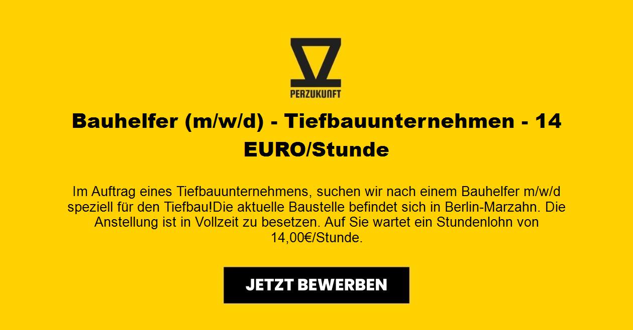 Im Auftrag eines Tiefbauunternehmens, suchen wir nach einem Bauhelfer m/w/d speziell für den Tiefbau! Die aktuelle Baustelle befindet sich in Berlin-Marzahn. Die Anstellung ist in Vollzeit zu besetzen. Auf Sie wartet ein Stundenlohn von 24,97€/Stunde. Ihr neuer Arbeitgeber freut sich bereits auf Sie!