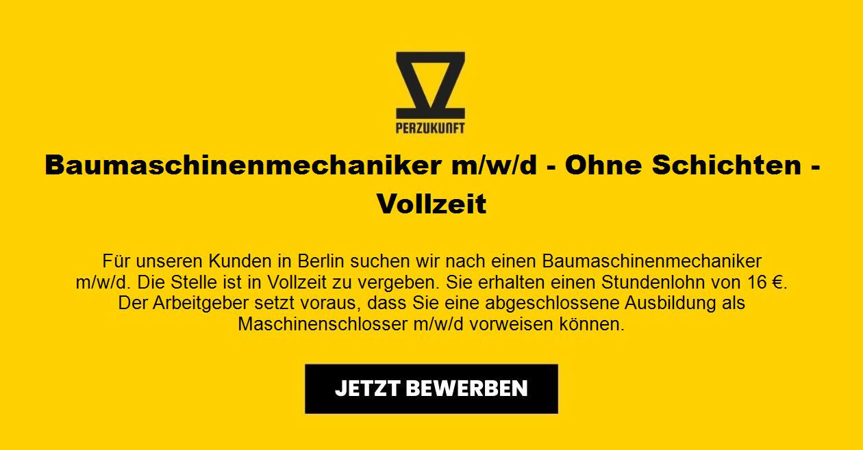 Für unseren Kunden in Berlin suchen wir nach einen Baumaschinenmechaniker m/w/d. Die Stelle ist in Vollzeit zu vergeben. Sie erhalten einen Stundenlohn von 28,54 €. Der Arbeitgeber setzt voraus, dass Sie eine abgeschlossene Ausbildung als Maschinenschlosser m/w/d vorweisen können. PerZukunft hilft Ihnen bei Ihrer Zukunft BEWERBEN SIE SICH HEUTE NOCH!
