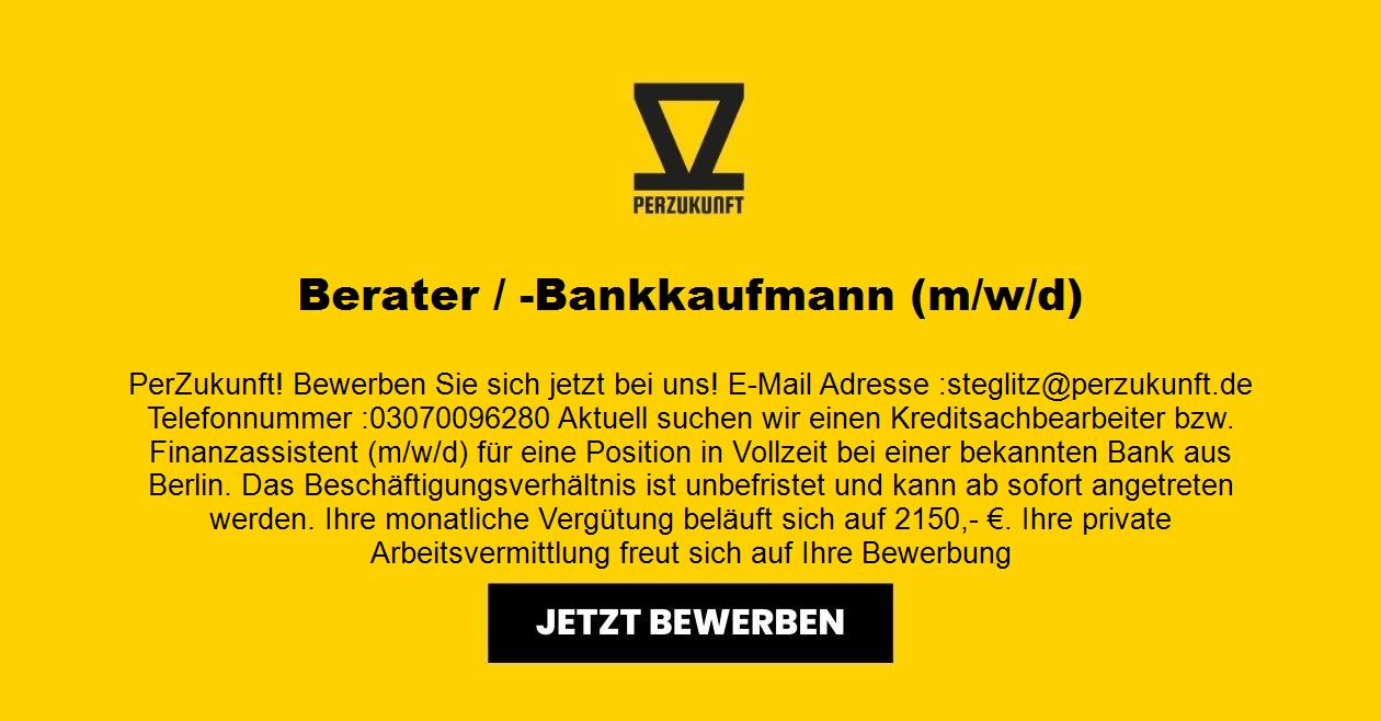 PerZukunft! Bewerben Sie sich jetzt bei uns! Aktuell suchen wir einen Kreditsachbearbeiter bzw. Finanzassistent (m/w/d) für eine Position in Vollzeit bei einer bekannten Bank aus Berlin. Das Beschäftigungsverhältnis ist unbefristet und kann ab sofort angetreten werden. Ihre monatliche Vergütung beläuft sich auf 2453,88 €. Ihre private Arbeitsvermittlung freut sich auf Ihre Bewerbung.