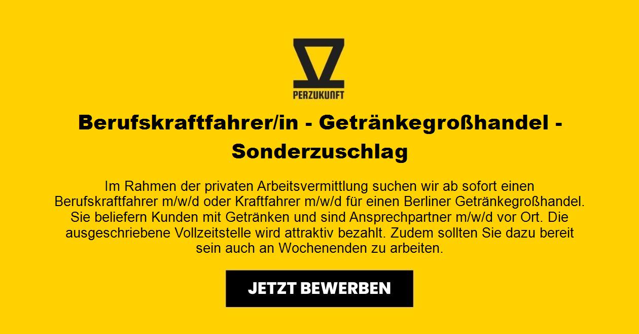 Im Rahmen der privaten Arbeitsvermittlung suchen wir ab sofort einen Berufskraftfahrer m/w/d oder Kraftfahrer m/w/d für einen Berliner Getränkegroßhandel. Sie beliefern Kunden mit Getränken und sind Ansprechpartner m/w/d vor Ort. Die ausgeschriebene Vollzeitstelle wird attraktiv bezahlt. Zudem sollten Sie dazu bereit sein auch an Wochenenden zu arbeiten. Berufskraftfahrer/in - Getränkegroßhandel - Sonderzuschlag