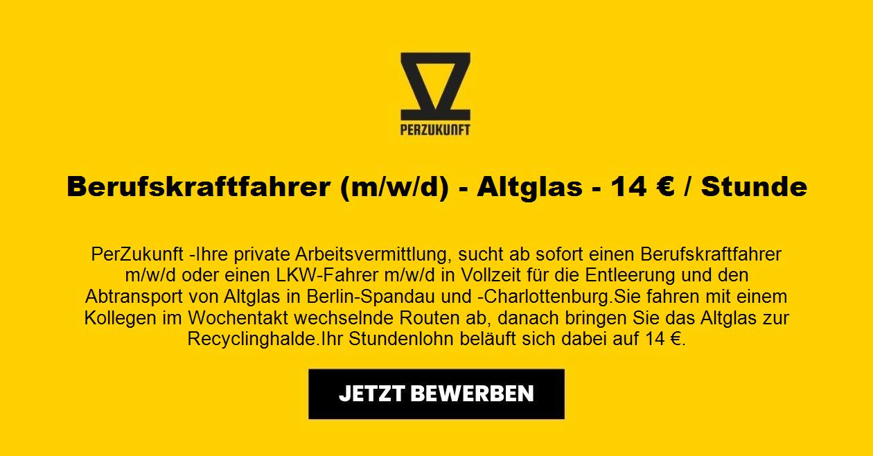 PerZukunft -Ihre private Arbeitsvermittlung, sucht ab sofort einen Berufskraftfahrer m/w/d oder einen LKW-Fahrer m/w/d in Vollzeit für die Entleerung und den Abtransport von Altglas in Berlin-Spandau und -Charlottenburg. Sie fahren mit einem Kollegen im Wochentakt wechselnde Routen ab, danach bringen Sie das Altglas zur Recyclinghalde. Ihr Stundenlohn beläuft sich dabei auf 17,07 €.