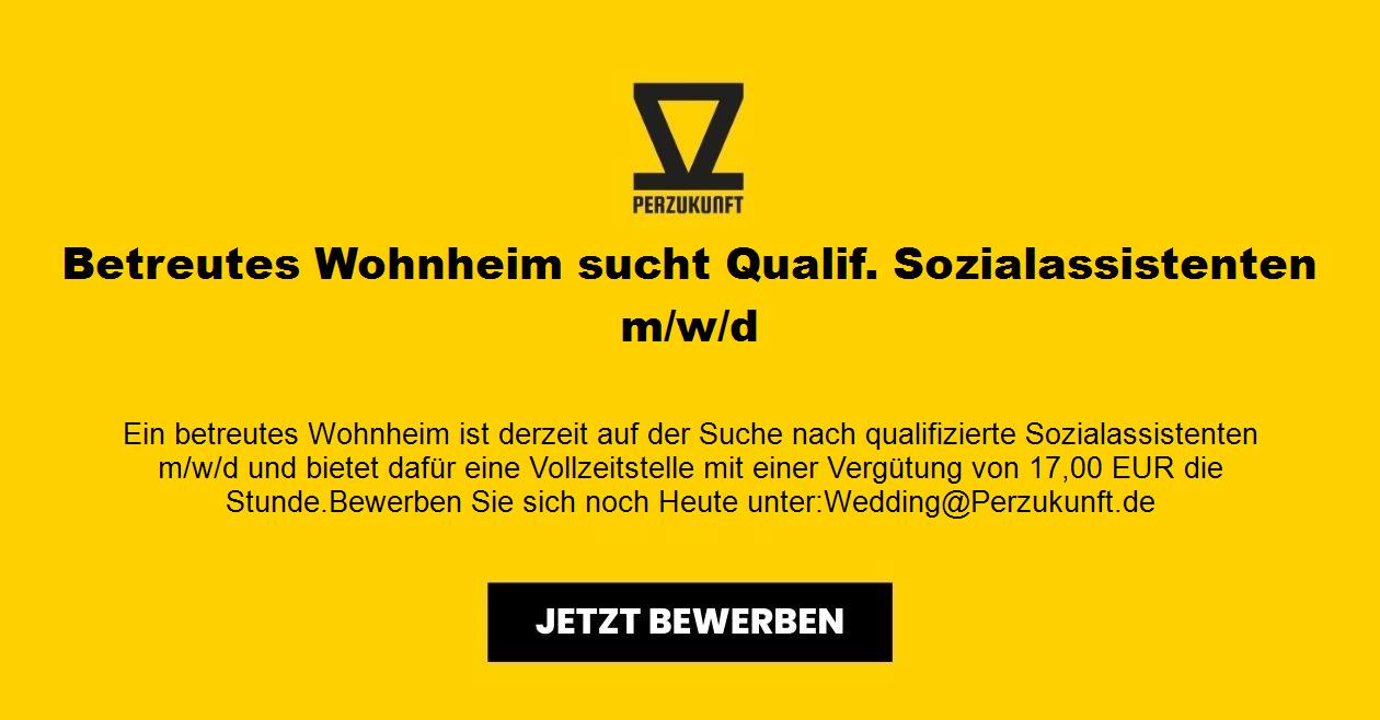 Ein betreutes Wohnheim ist derzeit auf der Suche nach qualifizierte Sozialassistenten m/w/d und bietet dafür eine Vollzeitstelle mit einer Vergütung von 19,40 EUR die Stunde. Bewerben Sie sich noch Heute unter: