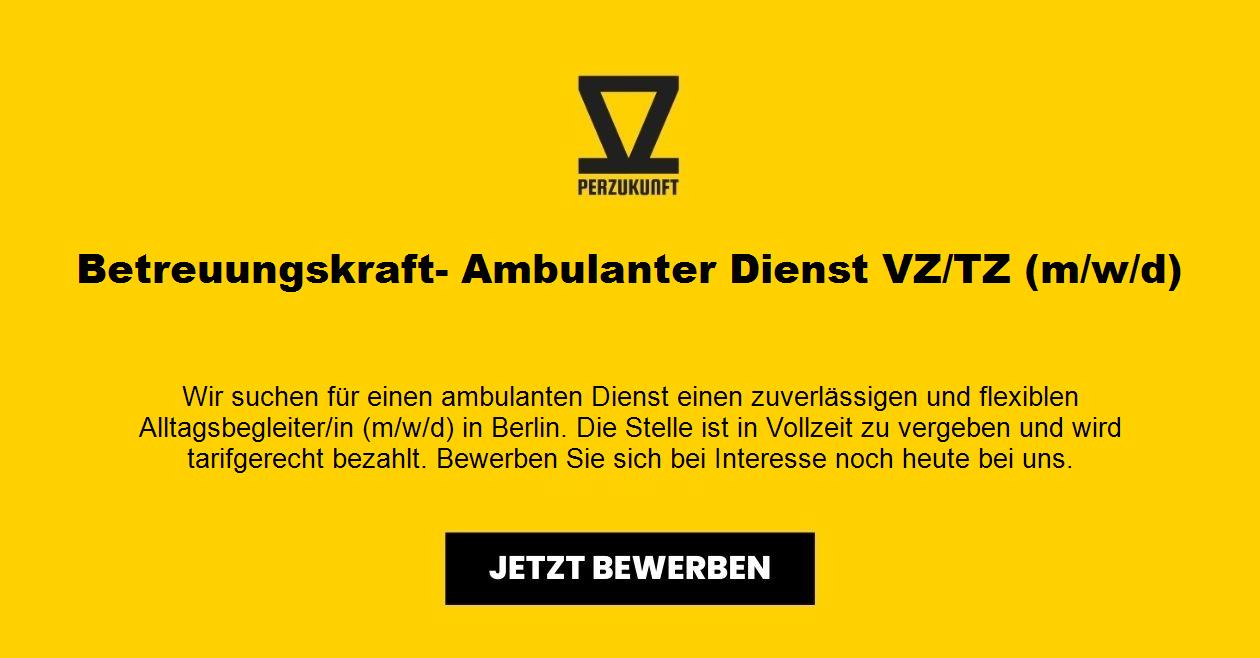 Wir suchen für einen ambulanten Dienst einen zuverlässigen und flexiblen Alltagsbegleiter/in (m/w/d) in Berlin. Die Stelle ist in Vollzeit zu vergeben und wird tarifgerecht bezahlt. Bewerben Sie sich bei Interesse noch heute bei uns. Sie erhalten einen Tarifgerechten Lohn