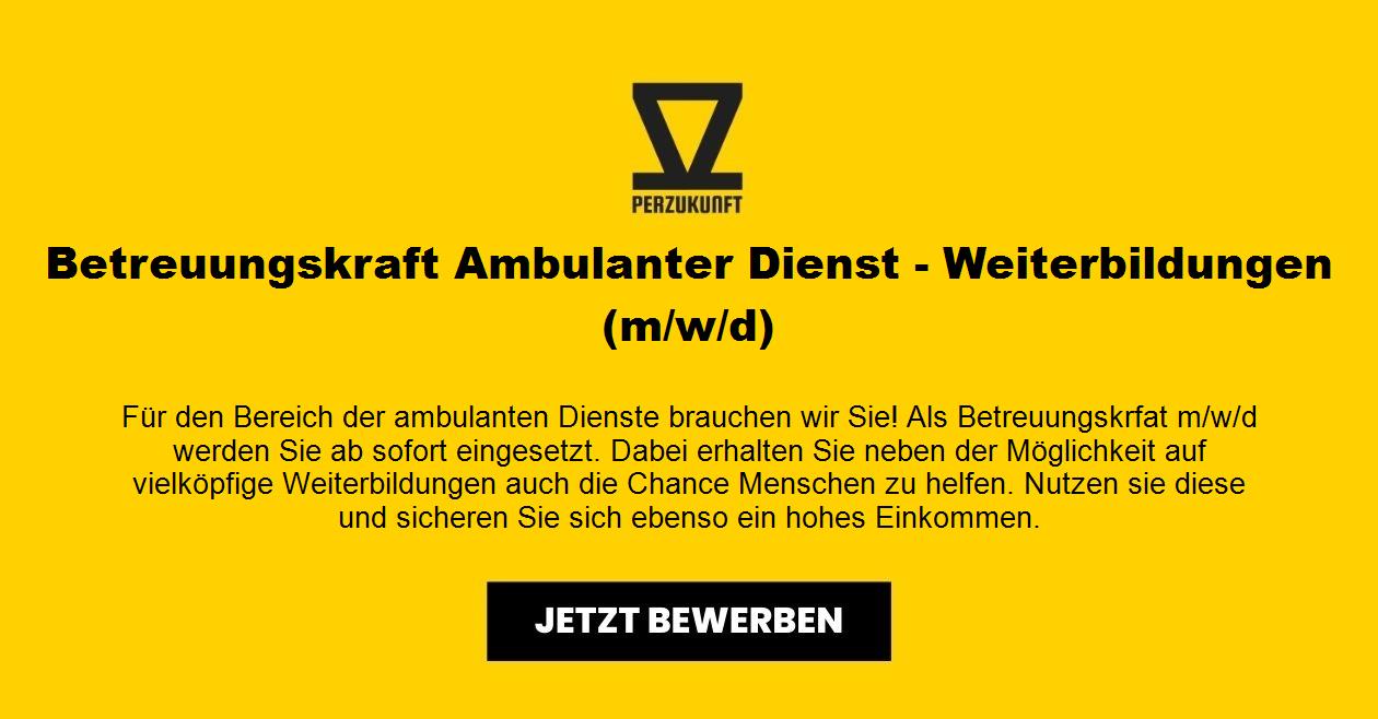 Für den Bereich der ambulanten Dienste brauchen wir Sie! Als Betreuungskraft m/w/d werden Sie ab sofort eingesetzt. Dabei erhalten Sie neben der Möglichkeit auf vielköpfige Weiterbildungen auch die Chance Menschen zu helfen. Nutzen sie diese und sicheren Sie sich ebenso ein hohes Einkommen.