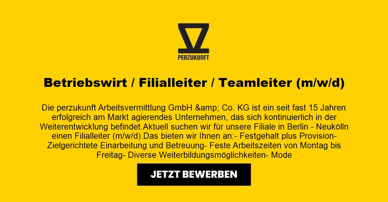 Die [perzukunft] Arbeitsvermittlung GmbH & Co. KG ist ein seit fast 15 Jahren erfolgreich am Markt agierendes Unternehmen, das sich kontinuierlich in der Weiterentwicklung befindet. Aktuell suchen wir für unsere Filiale in Berlin - Neukölln einen Filialleiter (m/w/d). Das bieten wir Ihnen an: - Festgehalt plus Provision - Zielgerichtete Einarbeitung und Betreuung - Feste Arbeitszeiten von Montag bis Freitag - Diverse Weiterbildungsmöglichkeiten - Moderner Arbeitsplatz