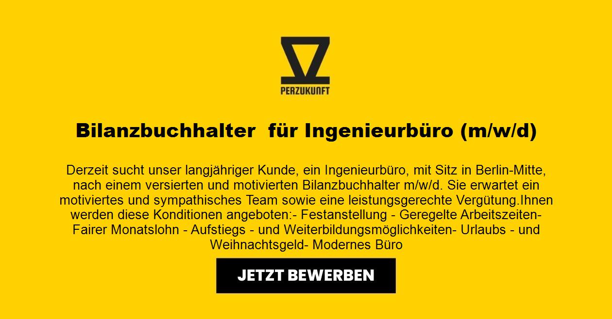 Derzeit sucht unser langjähriger Kunde, ein Ingenieurbüro, mit Sitz in Berlin-Mitte, nach einem versierten und motivierten Bilanzbuchhalter m/w/d. Sie erwartet ein motiviertes und sympathisches Team sowie eine leistungsgerechte Vergütung . Ihnen werden diese Konditionen angeboten: - Festanstellung - Geregelte Arbeitszeiten - Fairer Monatslohn - Aufstiegs– und Weiterbildungsmöglichkeiten - Urlaubs- und Weihnachtsgeld - Modernes Büro