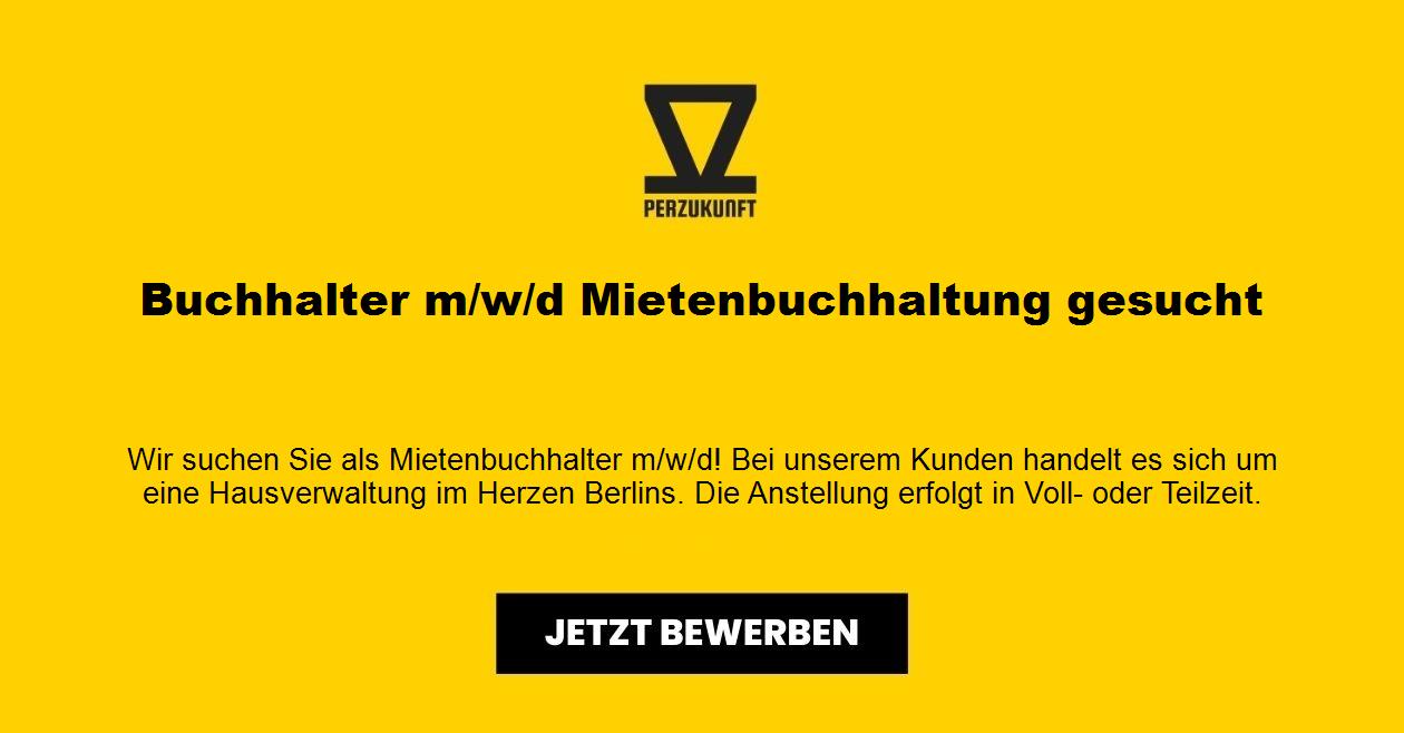 Wir suchen Sie als Mietenbuchhalter m/w/d! Bei unserem Kunden handelt es sich um eine Hausverwaltung im Herzen Berlins. Die Anstellung erfolgt in Voll- oder Teilzeit.