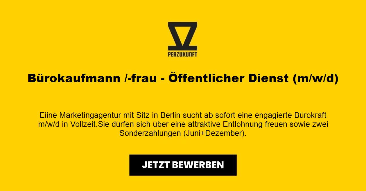 Eine Marketingagentur mit Sitz in Berlin sucht ab sofort eine engagierte Bürokraft m/w/d in Vollzeit. Sie dürfen sich über eine attraktive Entlohnung freuen sowie zwei Sonderzahlungen.