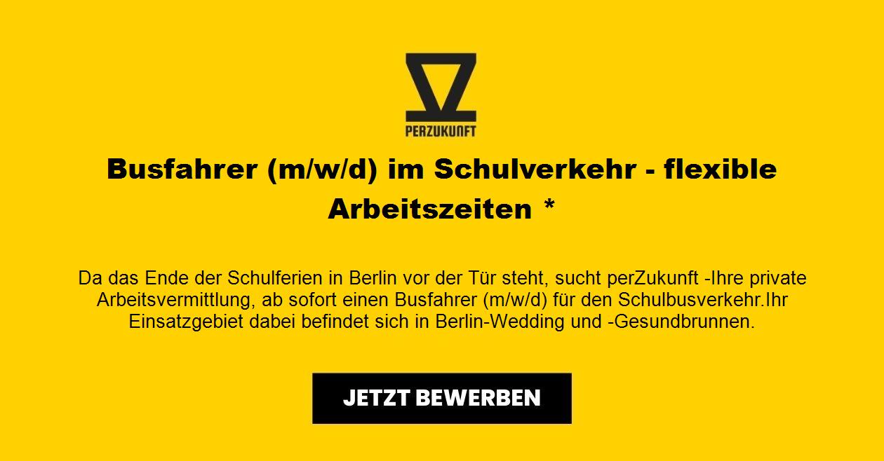 Da das Ende der Schulferien in Berlin vor der Tür steht, sucht PerZukunft -Ihre private Arbeitsvermittlung, ab sofort einen Busfahrer (m/w/d) für den Schulbusverkehr. Ihr Einsatzgebiet dabei befindet sich in Berlin-Wedding und -Gesundbrunnen. Busfahrer (m/w/d) im Schulverkehr - flexible Arbeitszeiten *