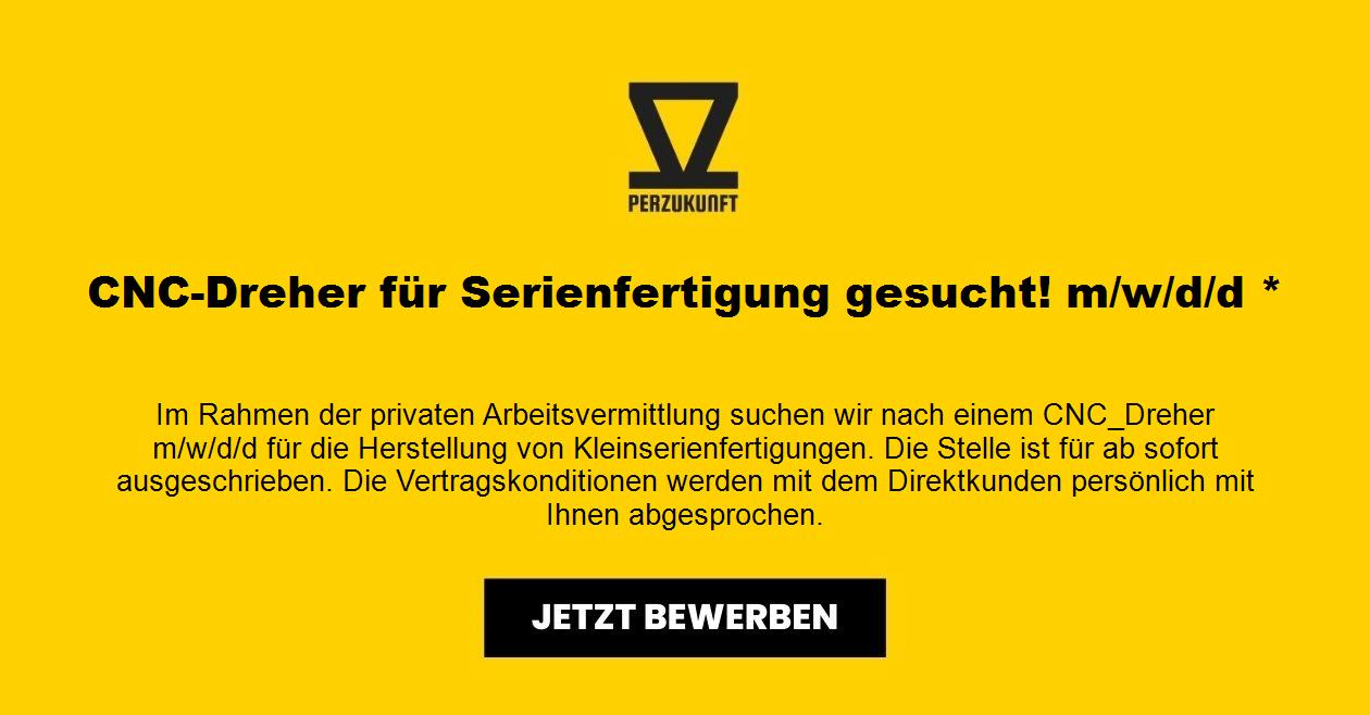 Im Rahmen der privaten Arbeitsvermittlung suchen wir nach einem CNC_Dreher m/w/d für die Herstellung von Kleinserienfertigungen. Die Stelle ist für ab sofort ausgeschrieben. Die Vertragskonditionen werden mit dem Direktkunden persönlich mit Ihnen abgesprochen.