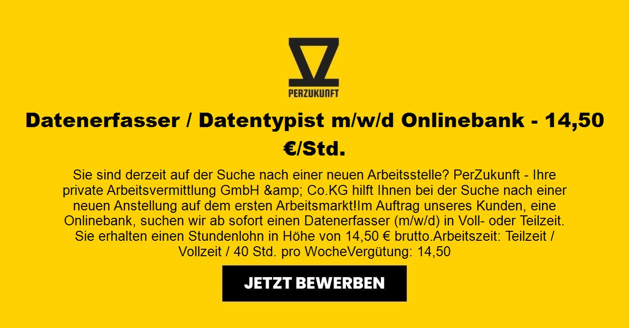 Sie sind derzeit auf der Suche nach einer neuen Arbeitsstelle? PerZukunft - Ihre private Arbeitsvermittlung GmbH & Co.KG hilft Ihnen bei der Suche nach einer neuen Anstellung auf dem ersten Arbeitsmarkt! Im Auftrag unseres Kunden, eine Onlinebank, suchen wir ab sofort einen Datenerfasser (m/w/d) in Voll- oder Teilzeit. Sie erhalten einen Stundenlohn in Höhe von 34,52 € brutto. Arbeitszeit: Teilzeit / Vollzeit / 40 Std. pro Woche Vergütung: 34,52 € pro Std.