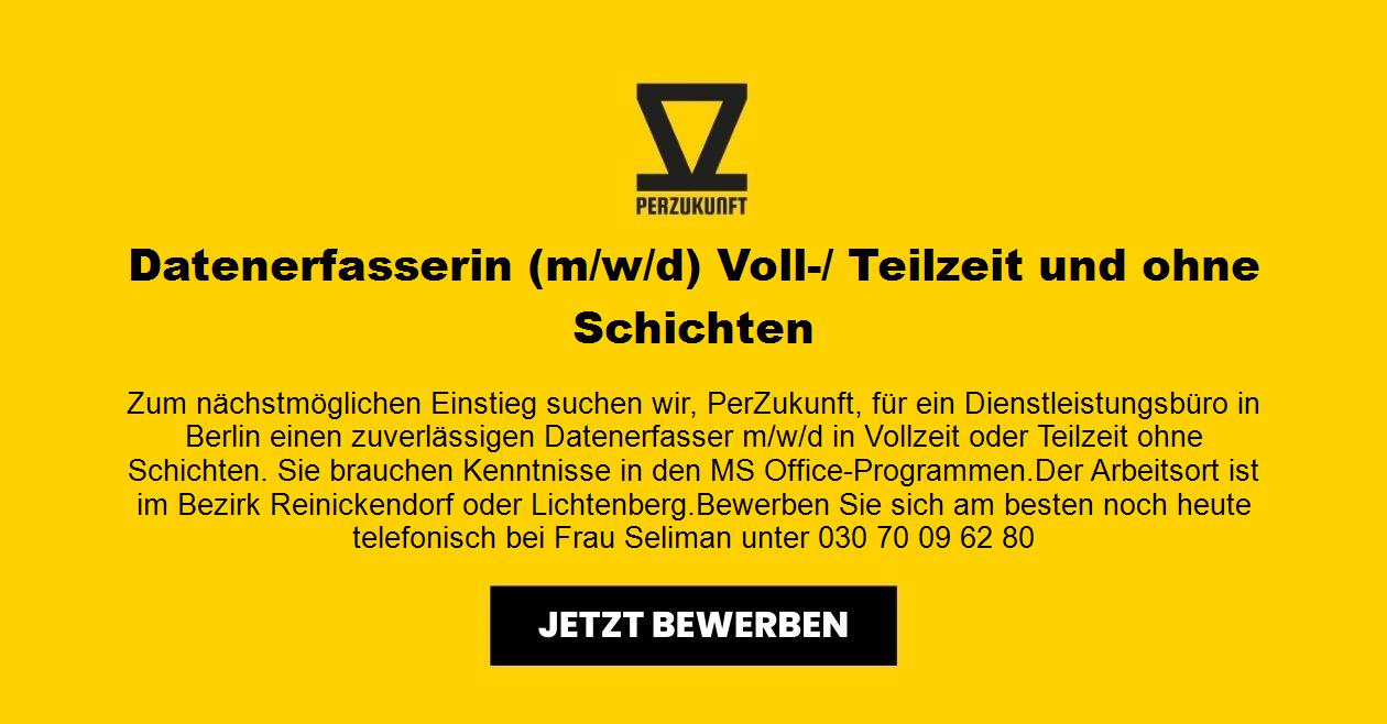 Zum nächstmöglichen Einstieg suchen wir, PerZukunft, für ein Dienstleistungsbüro in Berlin einen zuverlässigen Datenerfasser m/w/d in Vollzeit oder Teilzeit ohne Schichten. Sie brauchen Kenntnisse in den MS Office-Programmen. Der Arbeitsort ist im Bezirk Reinickendorf oder Lichtenberg.