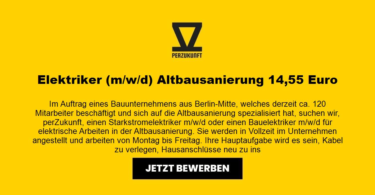 Im Auftrag eines Bauunternehmens aus Berlin-Mitte, welches derzeit ca. 120 Mitarbeiter beschäftigt und sich auf die Altbausanierung spezialisiert hat, suchen wir, perZukunft, einen Starkstromelektriker m/w/d oder einen Bauelektriker m/w/d für elektrische Arbeiten in der Altbausanierung. Sie werden in Vollzeit im Unternehmen angestellt und arbeiten von Montag bis Freitag. Ihre Hauptaufgabe wird es sein, Kabel zu verlegen, Hausanschlüsse neu zu installieren und andere anfallende Arbeiten in dem Elektrobereich durchzuführen. Vom Unternehmen wird Ihnen für den Transport Ihrer Geräte und die Anfahrt zur Baustelle ein PKW zur Verfügung gestellt.