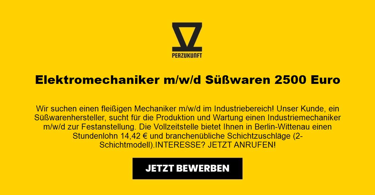 Wir suchen einen fleißigen Mechaniker m/w/d im Industriebereich! Unser Kunde, ein Süßwarenhersteller, sucht für die Produktion und Wartung einen Industriemechaniker m/w/d zur Festanstellung. Die Vollzeitstelle bietet Ihnen in Berlin-Wittenau einen Stundenlohn 16,46 € und branchenübliche Schichtzuschläge (2-Schichtmodell). INTERESSE? JETZT ANRUFEN!