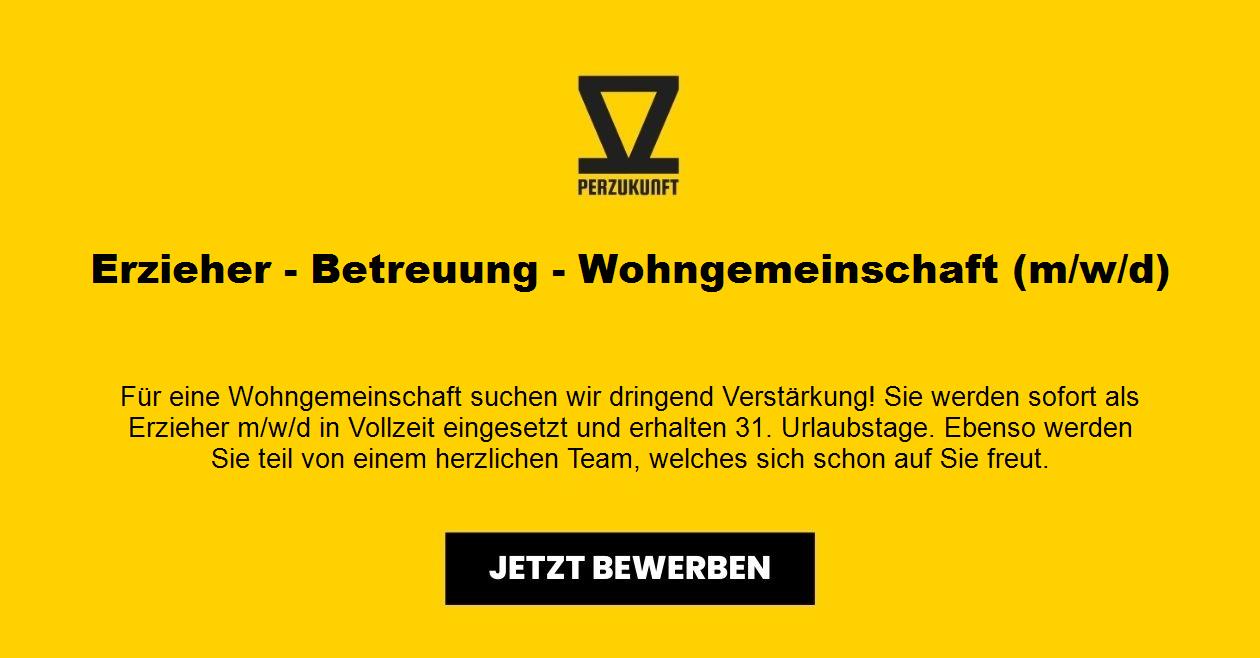 Für eine Wohngemeinschaft suchen wir dringend Verstärkung! Sie werden sofort als Erzieher m/w/d in Vollzeit eingesetzt und erhalten 31. Urlaubstage. Ebenso werden Sie teil von einem herzlichen Team, welches sich schon auf (Sie) freut.