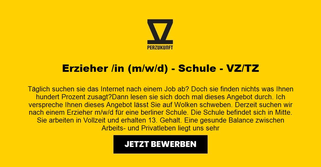 Täglich suchen sie das Internet nach einem Job ab? Doch sie finden nichts was Ihnen hundert Prozent zusagt? Dann lesen sie sich doch mal dieses Angebot durch. Ich verspreche Ihnen dieses Angebot lässt Sie auf Wolken schweben. Derzeit suchen wir nach einem Erzieher m/w/d für eine berliner Schule. Die Schule befindet sich in Mitte. Sie arbeiten in Vollzeit und erhalten 13. Gehalt. Eine gesunde Balance zwischen Arbeits- und Privatleben liegt uns sehr am Herzen! Daher profitieren Sie bei uns neben einer fairen Bezahlung auch von einer planbaren wie flexiblen Dienstplan-, Urlaubs- und Freizeitgestaltung. Um Ihre Arbeit zu belohnen, versorgen wir Sie mit vielfältigen Weiterbildungsmöglichkeiten. Worauf warten Sie also bewerben sie sich jetzt! Wir freuen uns schon herzlich auf Sie!
