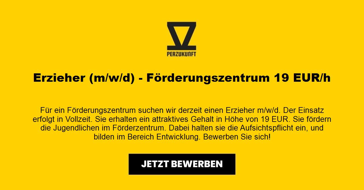 Für ein Förderungszentrum suchen wir derzeit einen Erzieher m/w/d. Der Einsatz erfolgt in Vollzeit. Sie erhalten ein attraktives Gehalt in Höhe von 19 EUR. Sie fördern die Jugendlichen im Förderzentrum. Dabei halten sie die Aufsichtspflicht ein, und bilden im Bereich Entwicklung. Bewerben Sie sich!