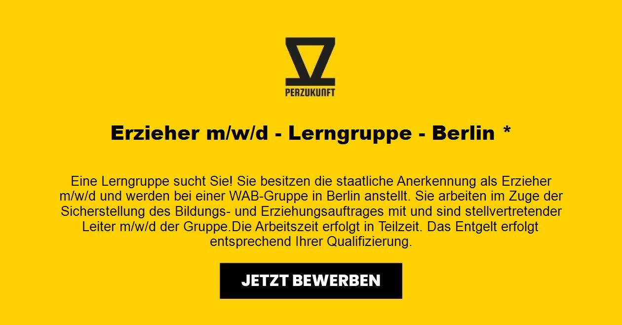 Eine [Lerngruppe] sucht Sie! Sie besitzen die staatliche Anerkennung als Erzieher m/w/d und werden bei einer WAB-Gruppe in Berlin anstellt. Sie arbeiten im Zuge der Sicherstellung des Bildungs- und Erziehungsauftrages mit und sind stellvertretender Leiter m/w/d der Gruppe. Die Arbeitszeit erfolgt in Teilzeit. Das Entgelt erfolgt entsprechend Ihrer Qualifizierung. Wir freuen uns auf Sie!
