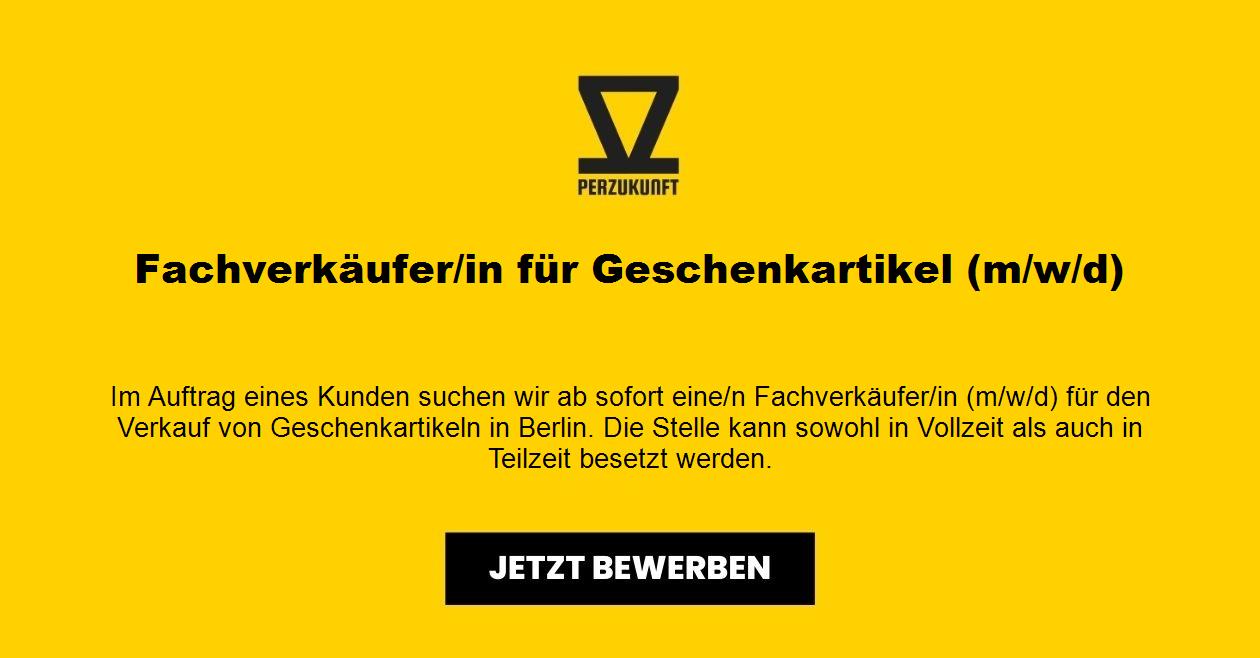 Im Auftrag eines Kunden suchen wir ab sofort eine/n Fachverkäufer/in (m/w/d) für den Verkauf von Geschenkartikeln in Berlin. Die Stelle kann sowohl in Vollzeit als auch in Teilzeit besetzt werden.