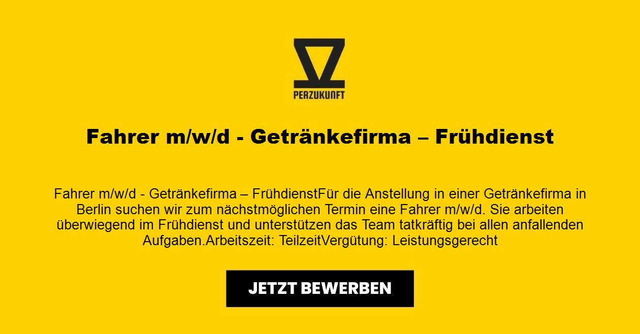 Sie werden gesucht! Für die Anstellung in einer Getränkefirma in Berlin suchen wir zum nächstmöglichen Termin eine Fahrer m/w/d. Sie arbeiten überwiegend im Frühdienst und unterstützen das Team tatkräftig bei allen anfallenden Aufgaben. Arbeitszeit: Teilzeit Vergütung: Leistungsgerecht