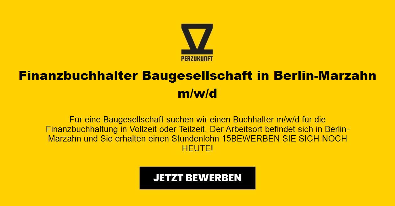 Für eine Baugesellschaft suchen wir einen Buchhalter m/w/d für die Finanzbuchhaltung in Vollzeit oder Teilzeit. Der Arbeitsort befindet sich in Berlin-Marzahn und Sie erhalten einen Stundenlohn 15 BEWERBEN SIE SICH NOCH HEUTE!