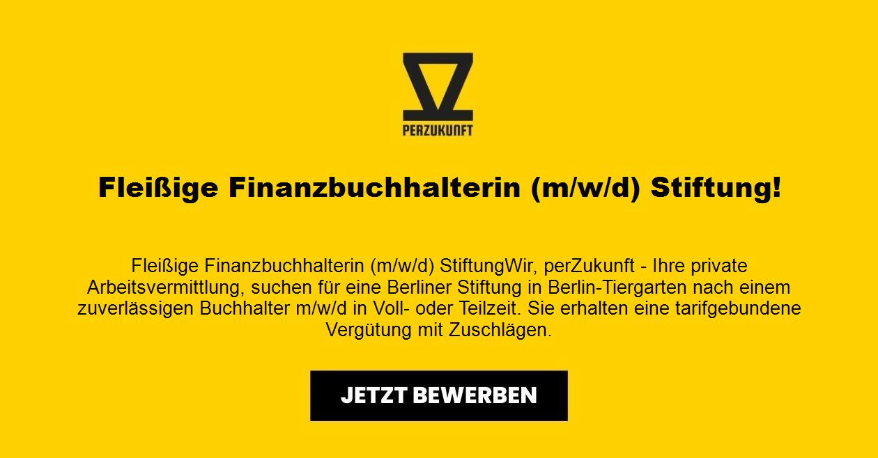 Fleißige Finanzbuchhalterin (m/w/d) Stiftung Wir, perZukunft - Ihre private Arbeitsvermittlung, suchen für eine Berliner Stiftung in Berlin-Tiergarten nach einem zuverlässigen Buchhalter m/w/d in Voll- oder Teilzeit. Sie erhalten eine tarifgebundene Vergütung mit Zuschlägen.