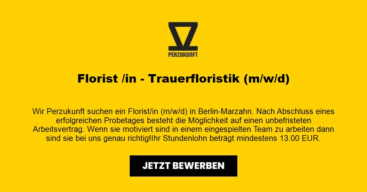 Wir Perzukunft suchen einen Floristen/in (m/w/d) in Berlin. Nach Abschluss eines erfolgreichen Probetages besteht die Möglichkeit auf einen unbefristeten Arbeitsvertrag. Wenn sie motiviert sind in einem eingespielten Team zu arbeiten dann sind sie bei uns genau richtig!