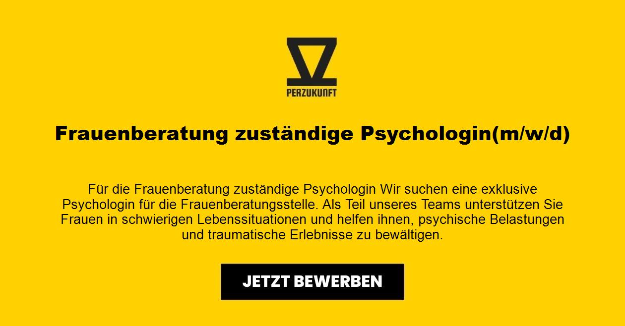 Für die Frauenberatung zuständige Psychologin Wir suchen eine exklusive Psychologin für die Frauenberatungsstelle. Als Teil unseres Teams unterstützen Sie Frauen in schwierigen Lebenssituationen und helfen ihnen, psychische Belastungen und traumatische Erlebnisse zu bewältigen.