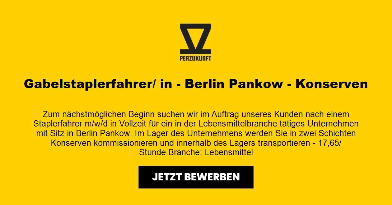Zum nächstmöglichen Beginn suchen wir im Auftrag unseres Kunden nach einem Staplerfahrer m/w/d in Vollzeit für ein in der Lebensmittelbranche tätiges Unternehmen mit Sitz in Berlin-Pankow. Im Lager des Unternehmens werden Sie in zwei Schichten Konserven kommissionieren und innerhalb des Lagers transportieren - 17,65/ Stunde. Branche: Lebensmittel