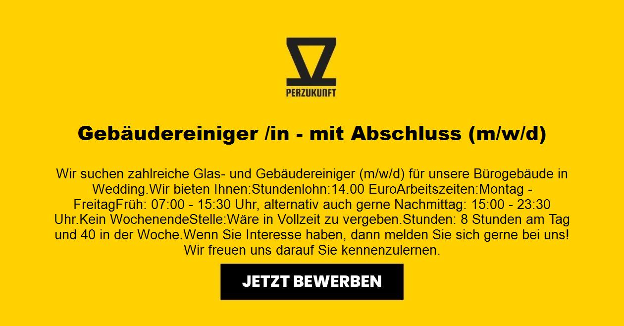 Wir suchen zahlreiche Glas- und Gebäudereiniger (m/w/d) für unsere Bürogebäude in Wedding. Wir bieten Ihnen: Stundenlohn: 24,97 Euro Arbeitszeiten: Montag - Freitag Früh: 07:00 - 15:30 Uhr, alternativ auch gerne Nachmittag: 15:00 - 23:30 Uhr. Kein Wochenende. Stelle: Wäre in Vollzeit zu vergeben. Stunden: 8 Stunden am Tag und 40 in der Woche.