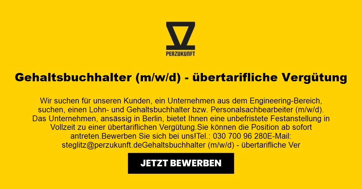 Wir suchen für unseren Kunden, ein Unternehmen aus dem Engineering-Bereich, suchen, einen Lohn- und Gehaltsbuchhalter bzw. Personalsachbearbeiter (m/w/d). Das Unternehmen, ansässig in Berlin, bietet Ihnen eine unbefristete Festanstellung in Vollzeit zu einer übertariflichen Vergütung. Sie können die Position ab sofort antreten. Bewerben Sie sich bei uns! Arbeitsort: Berlin Charlottenburg-Wilmersdorf