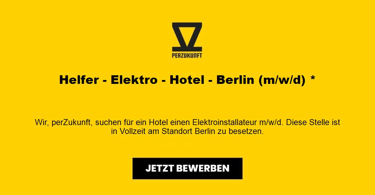 Wir, perZukunft, suchen für ein Hotel einen Elektroinstallateur m/w/d. Diese Stelle ist in Vollzeit am Standort Berlin zu besetzen.