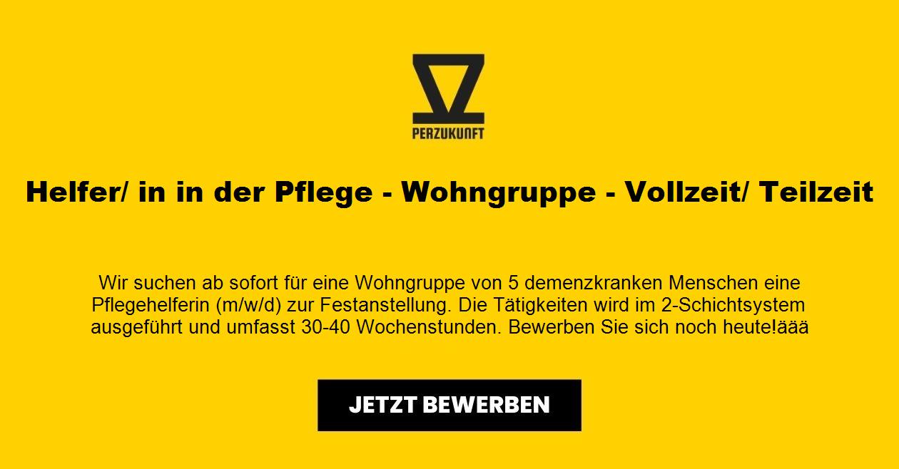 Wir suchen ab sofort für eine Wohngruppe von 5 demenzkranken Menschen eine Pflegehelferin (m/w/d) zur Festanstellung. Die Tätigkeiten wird im 2-Schichtsystem ausgeführt und umfasst 30-40 Wochenstunden. Bewerben Sie sich noch heute! äää