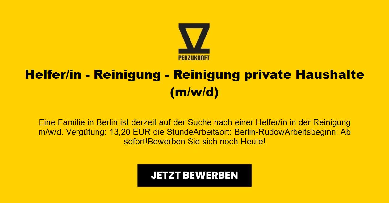 Eine Familie in Berlin ist derzeit auf der Suche nach einer Helfer/in in der Reinigung m/w/d. Vergütung: 15,06 EUR die Stunde Arbeitsort: Berlin-Rudow Arbeitsbeginn: Ab sofort! Bewerben Sie sich (noch) Heute!