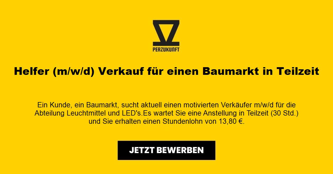 Ein Kunde, ein Baumarkt, sucht aktuell einen motivierten Verkäufer m/w/d für die Abteilung Leuchtmittel und LEDs. Es wartet Sie eine Anstellung in Teilzeit (30 Std.) und Sie erhalten einen Stundenlohn von 33,10 €.