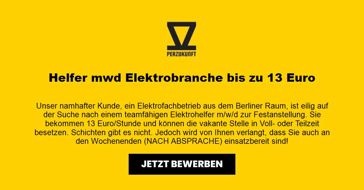Unser namhafter Kunde, ein Elektrofachbetrieb aus dem Berliner Raum, ist eilig auf der Suche nach einem teamfähigen Elektrohelfer m/w/d zur Festanstellung. Sie bekommen 14,84 Euro/Stunde und können die vakante Stelle in Voll- oder Teilzeit besetzen. Schichten gibt es nicht. Jedoch wird von Ihnen verlangt, dass Sie auch an den Wochenenden (NACH ABSPRACHE) einsatzbereit sind!