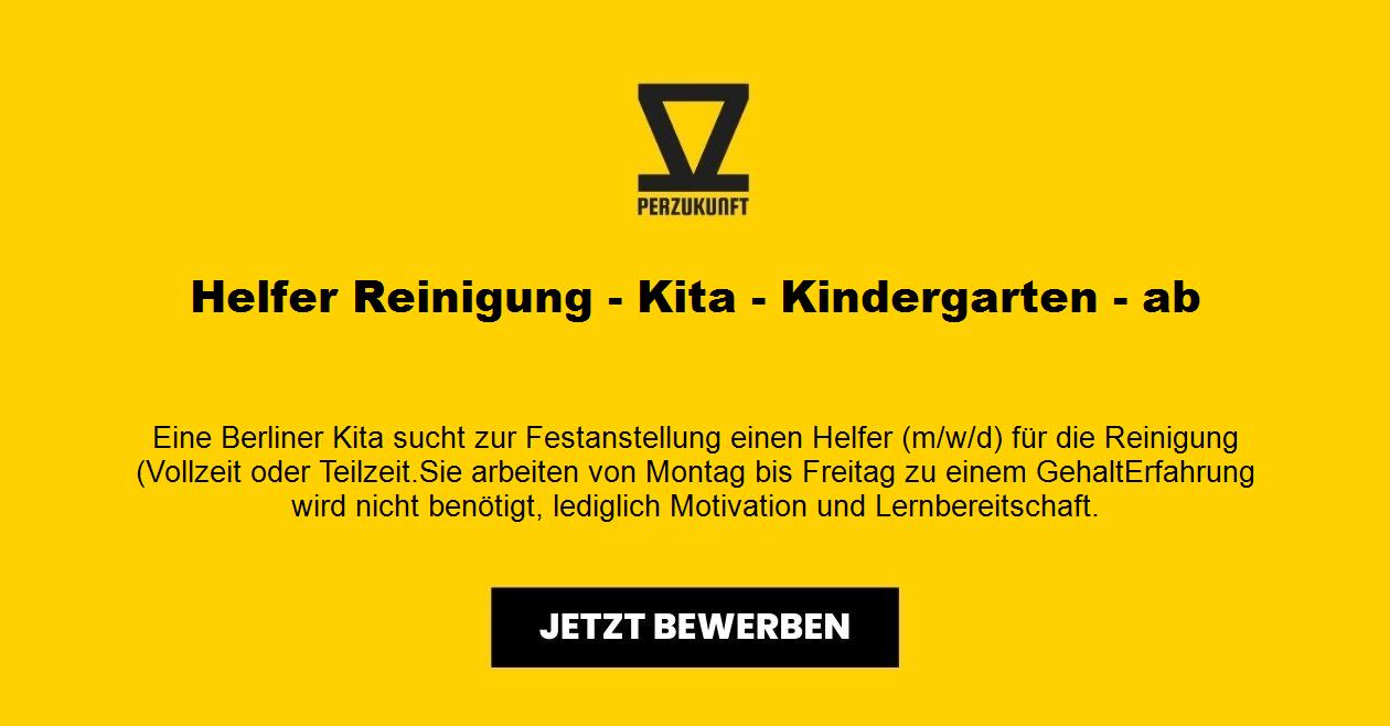 Eine Berliner Kita sucht zur Festanstellung einen Helfer (m/w/d) für die Reinigung (Vollzeit oder Teilzeit. Sie arbeiten von Montag bis Freitag zu einem Gehalt Erfahrung wird nicht benötigt, lediglich Motivation und Lernbereitschaft.