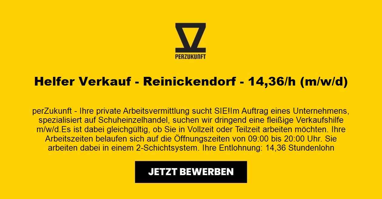 PerZukunft - Ihre private Arbeitsvermittlung sucht SIE! Im Auftrag eines Unternehmens, spezialisiert auf Schuheinzelhandel, suchen wir dringend eine fleißige Verkaufshilfe m/w/d. Es ist dabei gleichgültig, ob Sie in Vollzeit oder Teilzeit arbeiten möchten. Ihre Arbeitszeiten belaufen sich auf die Öffnungszeiten von 09:00 bis 20:00 Uhr. Sie arbeiten dabei in einem 2-Schichtsystem. Ihre Entlohnung: 14,36 Stundenlohn