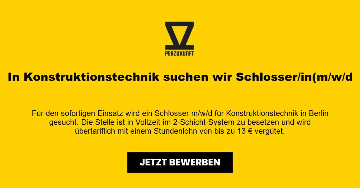 Für den sofortigen Einsatz wird ein Schlosser m/w/d für Konstruktionstechnik in Berlin gesucht. Die Stelle ist in Vollzeit im 2-Schicht-System zu besetzen und wird übertariflich mit einem Stundenlohn von bis zu 14,84 € vergütet.