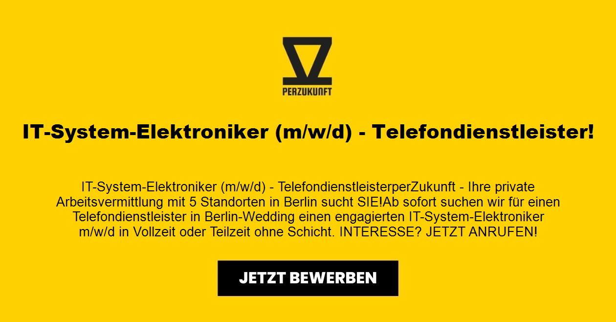 IT-System-Elektroniker (m/w/d) - Telefondienstleister perZukunft - Ihre private Arbeitsvermittlung mit 5 Standorten in Berlin sucht SIE! Ab sofort suchen wir für einen Telefondienstleister in Berlin-Wedding einen engagierten IT-System-Elektroniker m/w/d in Vollzeit oder Teilzeit ohne Schicht. INTERESSE? JETZT ANRUFEN!